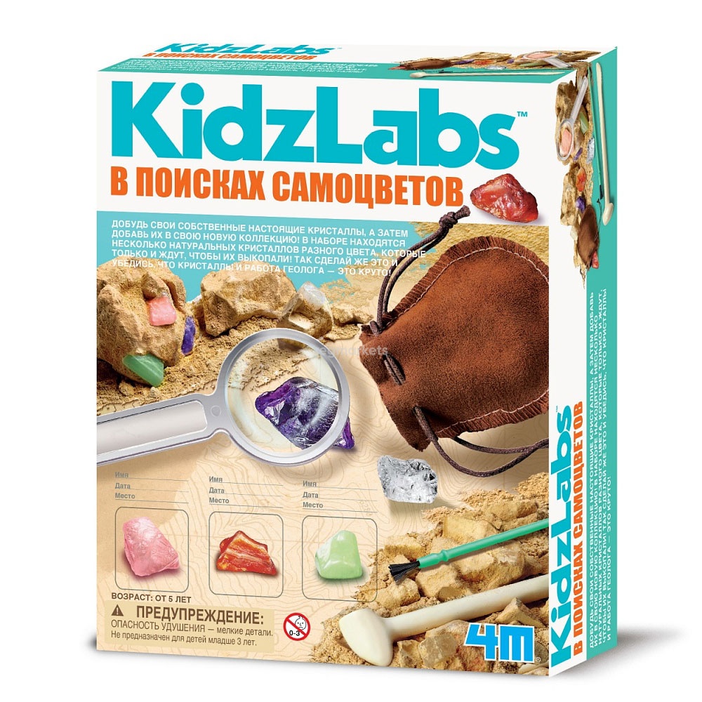 «В поисках самоцветов» — это не просто научно-познавательный набор, а настоящий клад! Во всех смыслах этого слова. Открыв коробку, ребенок обнаружит всего лишь кусок гипса. Но внутри брикета спрятаны ценные сокровища — 8 изумительных природных кристаллов. Тут и кварц, и аметист, и агат, и доломит. Вооружившись лопаткой и кисточкой, входящими в набор, юный кладоискатель охотно примется за дело и будет кропотливо расчищать гипс, чтобы добраться до волшебных камней. Добыча кристаллов потребует усидчивости, терпения и старания. Процесс может занять несколько часов, а то и несколько дней. Но ожидание того стоит! По завершении работы маленький геолог станет обладателем целой коллекции самоцветов. Ребенок будет восторженно рассматривать свои находки через увеличительное стекло, прилагаемое к комплекту. Внимательно изучив камни и сравнив их с описанием в инструкции, он без труда определит, к какому виду относится каждый экземпляр его коллекции. Набор открывает дверь в мир геологии и минералогии. В инструкции представлены интересные научные материалы о природе таинственных кристаллов и их появлении в недрах земли. С таким набором ребенок расширит кругозор и полюбит естественные науки. В комплекте Гипсовый брикет с 8 кристаллами внутри Лопаточка для раскопок Увеличительное стекло Кисточка Набор ячеек и карточек Мешочек для хранения Инструкция на русском языке Как добыть самоцветы? Аккуратно расчистите гипс с помощью молоточка. Когда гипс станет разрушаться, и на поверхности покажется первый кристалл, переверните лопатку плоской стороной и работайте крайне осторожно, чтобы не разрушить хрупкий камень. Используйте кисточку, чтобы удалить гипсовую пыль с ваших самоцветов. С помощью зубной щетки и теплой мыльной воды очистите кристаллы и положите сохнуть на газету. Изучите каждый камень, сравнив его с описанием в таблице. Создайте свою коллекцию самоцветов. Впишите сведения о найденных кристаллах в специальную карточку. Прикрепите к карточке ячейку с камнем. Коллекция готова! Можете показывать ее друзьям и родственникам, гордо уточняя, что все эти кристаллы вы добыли самостоятельно. Самоцветы можно не только добывать и изучать. Их можно дарить родным и близким. В древности считалось, что кристаллы обладают мистической силой и приносят удачу. Выберите один из ваших самоцветов, положите его в подарочный мешок из набора и вручите кому человеку, которого любите больше всего. Он обязательно оценит ваш необычный подарок!