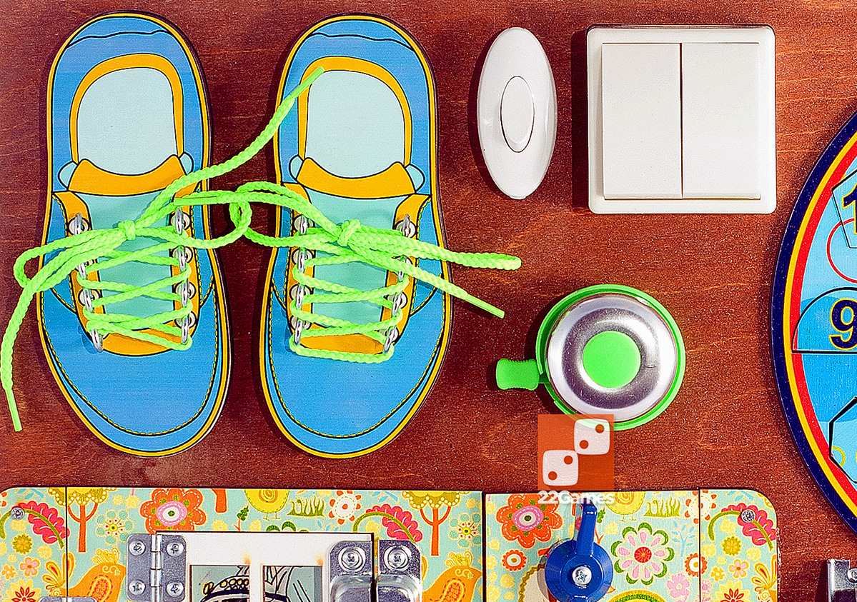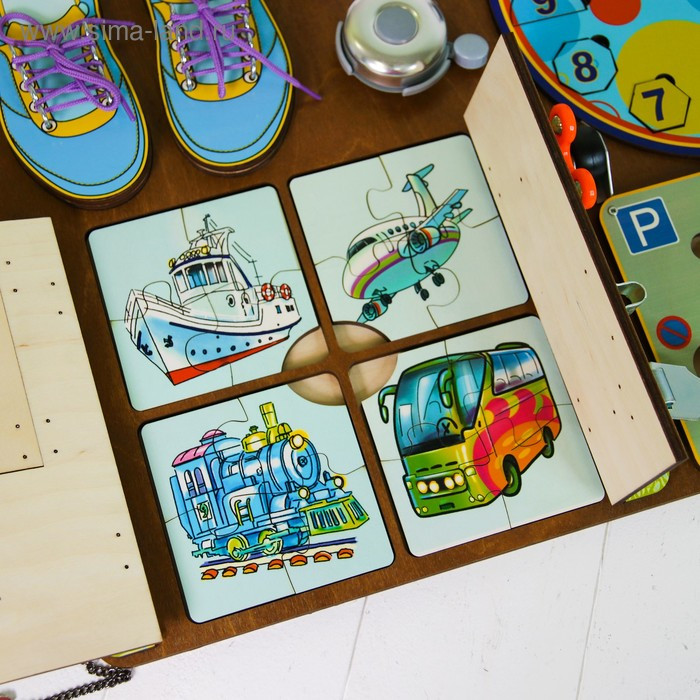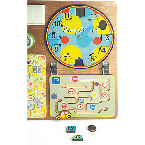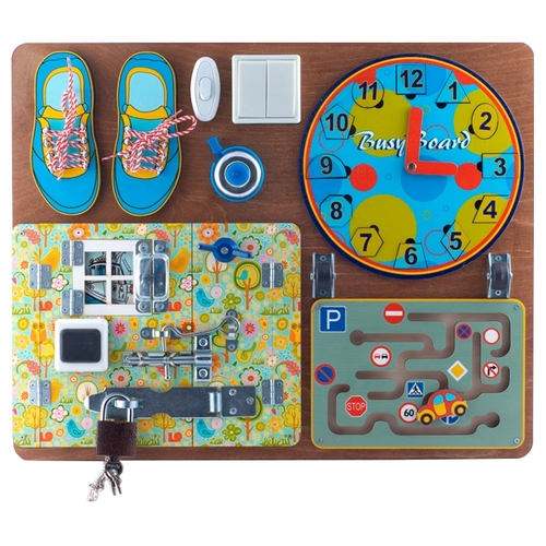Развивающая доска-головоломка сможет на долго отвлечь любопытного малыша огромным количеством разных подвижных интересных вещей. Тут вам и замочки, и щеколды, и шнурки, часы, дверцы, за которые так хочется заглянуть, лабиринт с машинкой и многое другое!