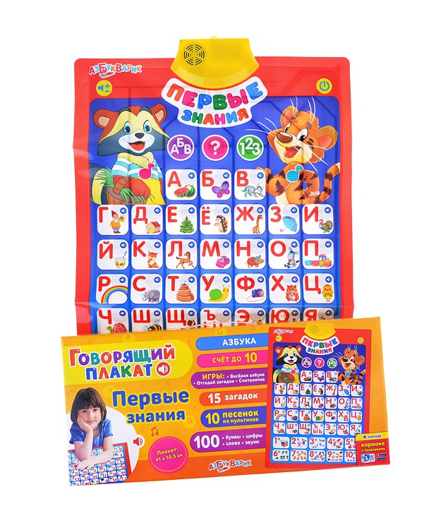 - Хотите, чтобы ваш ребёнок легко выучил буквы и освоил счёт до 10? Интерактивный говорящий плакат «Первые знания» – отличный выбор! Большие буквы, яркие картинки, загадки, песенки мультяшек, умные игры («Считалочка» и «Весёлая азбука», "Отгадай загадки") – всё это сделает обучение весёлым и интересным! Плакат можно повесить на стену или играть с ним на столе.