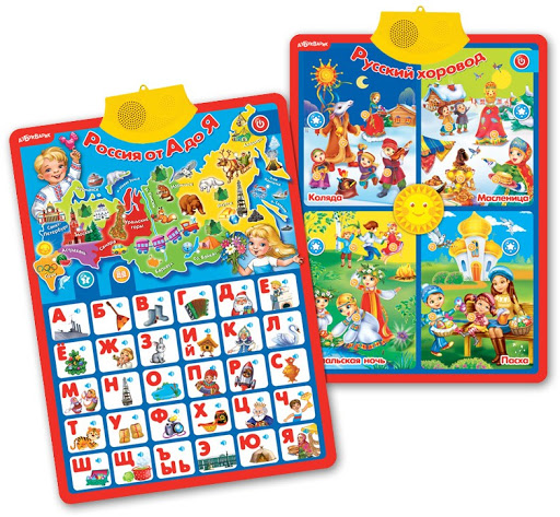 На первой стороне плаката представлены интересные факты о России и алфавит, на второй – изображения, которые расскажут о русских праздниках. Чтобы обучение не было скучным, малышей ждут весёлые загадки и песенки ("Калинка", "Светит месяц", "Россия", "Го-го-го, коза!", "Ты, мороз, мороз, мороз", "Барыня", "Солнышко-колоколнышко", "Коробейники", "Я на горку шла", "Выйду на улицу", "Как у наших у ворот", "Во поле берёза стояла", "Расти, коса, до пояса", "Мир похож на цветной луг", "Пасхальная песенка", "Самая счастливая", "Радуга-дуга", "Валенки"). Плакат можно повесить на стену или играть с ним, где будет удобнее. Громкость звука регулируется.