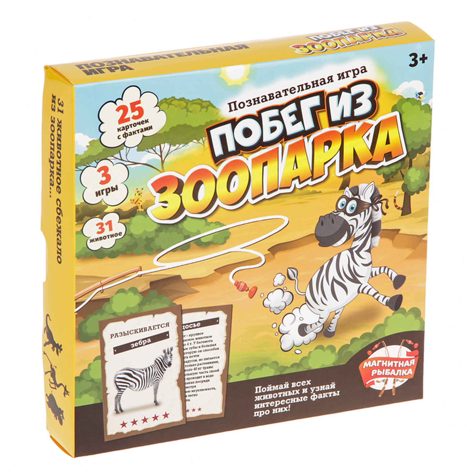 Оригинальная познавательная игра "Побег из зоопарка" построена по типу знакомой многим магнитной рыбалки. Перед началом партии на красочном игровом поле следует разместить фигурные картинки животных. Изображения зверушек оснащены магнитными вставками.