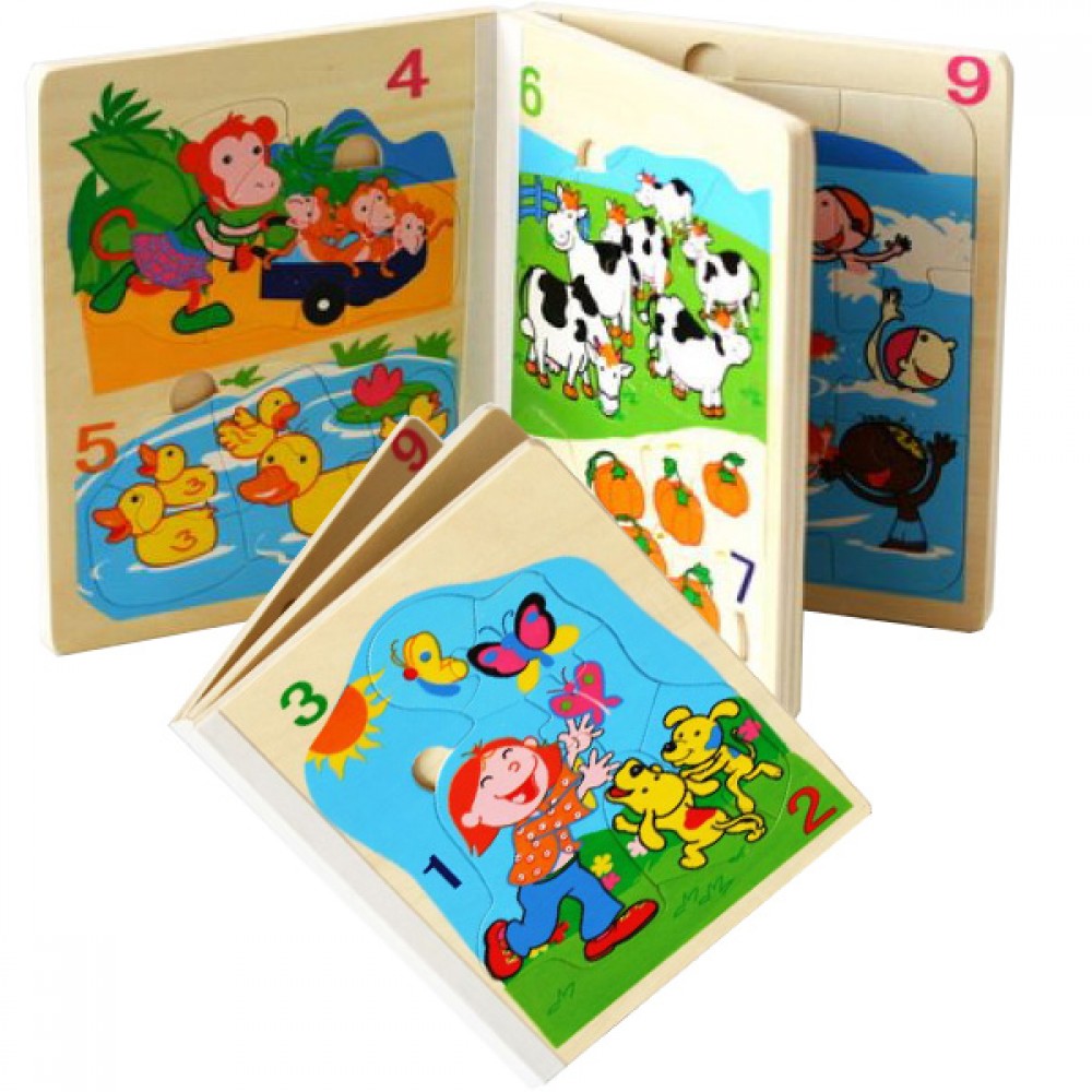 На каждой страничке книги-пазла изображены цифры от 1 до 10, а картинка-пазл данной страницы содержит соответствующее цифрам количество животных, насекомых, людей и т.д.