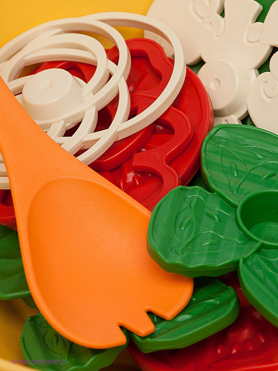 16 деталей, в том числе: миска, тарелка, 2 сервировочных прибора, 3 салатных листа, 3 огурца, 2 красных перца, 2 помидора, лук, грибы.