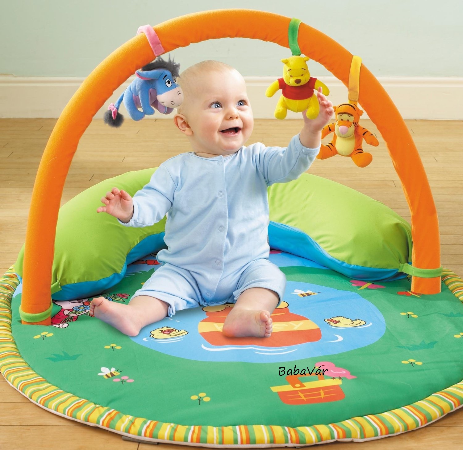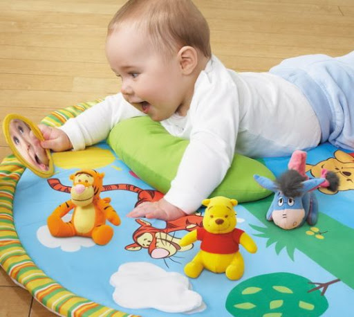 Малыш непременно заинтересуется окружающим пространством, помимо игрушек на дуге, его будут окружать красочные картинки на самом коврике. Здесь он найдет своих любимых героев: Винни Пуха, Иа и Тигру, но кроме них он еще обнаружит белое облако с шуршащим наполнителем, которое приподнимается вверх и веселое солнышко, на обратной стороне которого безопасное зеркало.