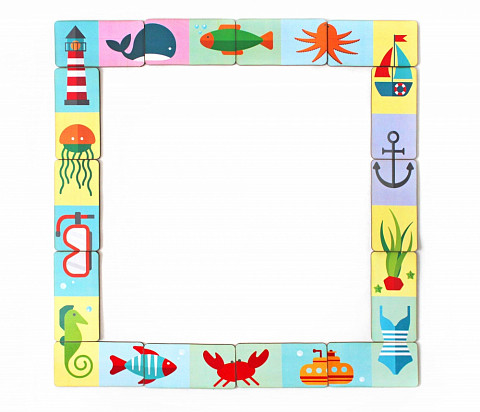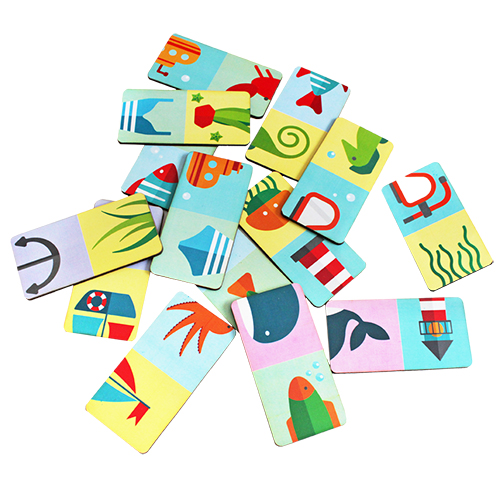 Комплект содержит 14 домино с изображениями морских обитателей. Участникам выдается по 4 штуки, начинать ход первым - по договоренности. В ходе игры участники выкладывают домино в цепочки, состыковывая их таким образом, чтобы картинка с одного конца домино совпадала с картинкой на конце цепочки. Если подходящего элемента нет, нужно взять из оставшейся стопки. Побеждает тот, кто первый освобождается от своих домино. В итоге должна получиться замкнутая цепочка.