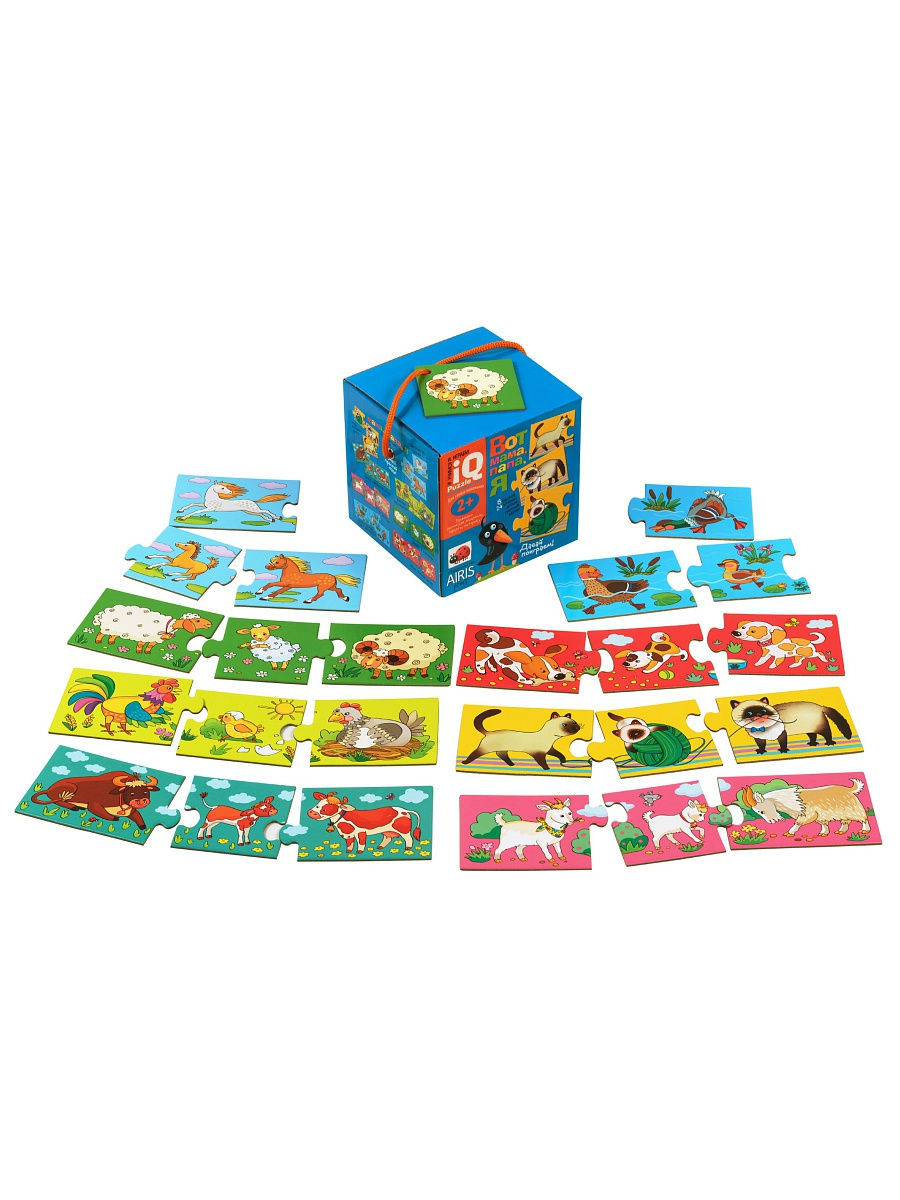 В наборе 8 пазлов из трёх частей с цветными картинками животных - мамы, папы и детёныша.
